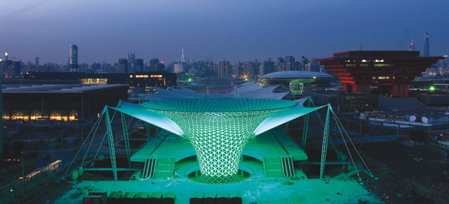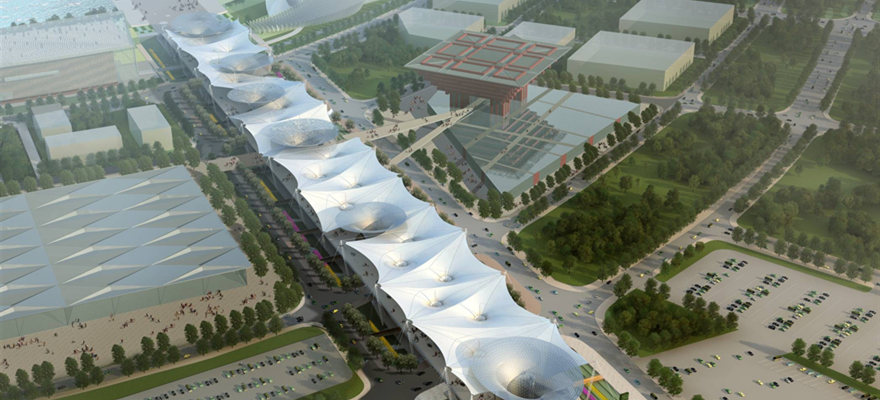 該項目南北長1045m,東西寬地下99.5m-110.5m,地面以上寬80m,基地面積130669m2,總建筑面積227169 m2,其中地上建筑面積42877 m2,地下建筑面積184292 m2。本工程屋頂包括膜結構屋頂和六個鋼結構網殼“陽光谷”。網殼高度:41m,用鋼量:約300噸,網殼節點數量約10600個,異形幕墻面積約3.5萬平方米。
